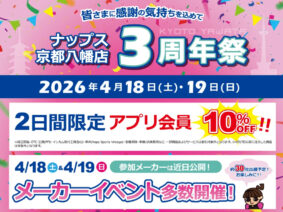 2026年4月18日~19日、ナップス京都八幡店3周年祭に参加します。